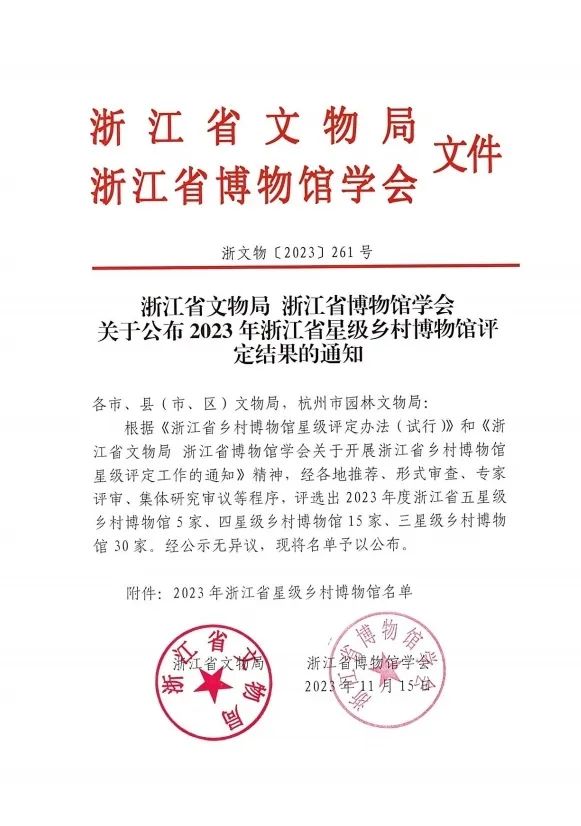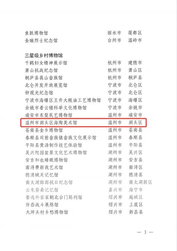 海陶美术馆 喜获全省首批星级乡村博物馆 11月15日,浙江省文物局和浙江省博物馆学会经各地推荐、形式审查、专家评审、集体研究审议等程序,评选出浙江省首批五星级乡村博物馆5家、四星级乡村博物馆15家、三星级乡村博物馆30家。其中,我区的海陶美术馆在全省692家乡村博物馆中脱颖而出,荣获省三星级乡村博物馆。 海陶美术馆坐落于北岙街道双垄村,馆内设有艺术展厅、体验教室、交流会客厅等,是一家以海陶的制作、文化传承、艺术品展示和文化交流等文化服务活动为一体的场馆。建成乡村博物馆以来,海陶美术馆积极拓展非遗体验项目,开发海陶研学体验课程,与各高校、中小学建立了非遗研学体验合作。结合海岛文化创新开发特色产品,获得了 2022 年浙江省博物馆文创产品大赛金奖、2022 年温州国际时尚文化产业博览会文化创意奖,并入围了“2023 年温州特色产品伴手礼名录”。还被授予温州市中小学生实践实训基地、温州市非遗百家坊、温州市儿童友好城市试点、温州市最美公共文化空间等多个称号。 截至目前我区已建成4家乡村博物馆,分别为2022年获评浙江省乡村博物馆的海陶美术馆、中仑村史馆、朝阳民俗馆和2023年获评浙江省乡村博物馆的霓屿紫菜馆。中仑村史馆按照“尊重历史、体现特点”的原则,围绕“渔村历史文化教育和乡愁记忆场馆”的主题展开。朝阳民俗馆以展示地方民俗为主线,突出展示本地历史演变及海洋特色文化。霓屿紫菜馆以养民生产生活场景及劳作渔具为主要场景展示紫菜种性、特质、功用及其育苗培育、海上养殖、成品加工工艺。 乡村博物馆是博物馆“贴近实际、贴近生活、贴近群众”的一种探索途径,它突显地域特色,展现了洞头当地文化,增加群众了对本土历史的了解和乡愁记忆,同时切实提升群众的文化自信和精神内涵,丰富了乡村的文化生活,为乡村振兴增添一抹文化亮色。 —THE END—