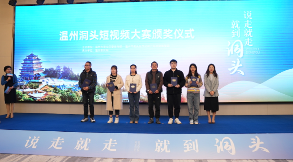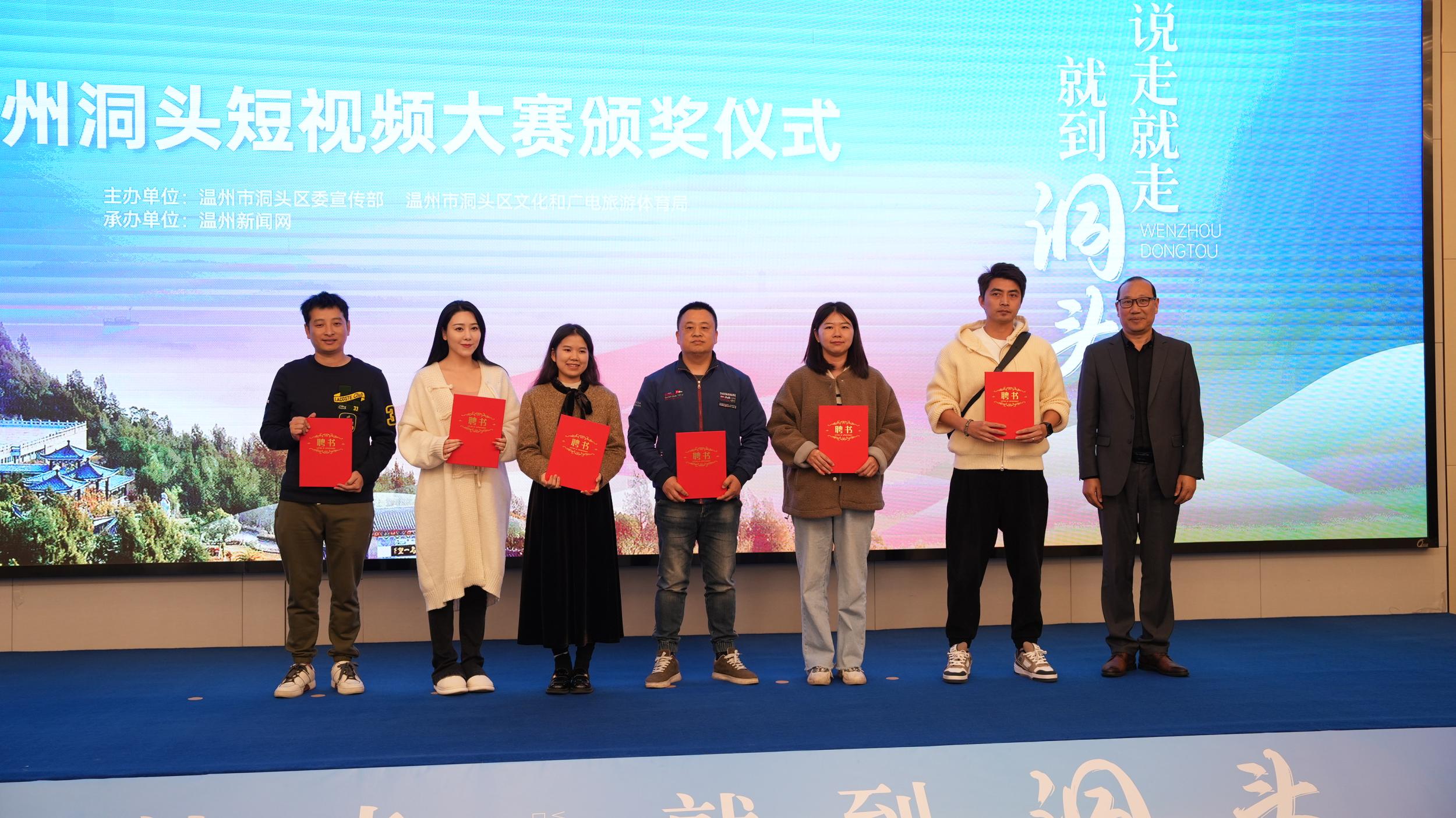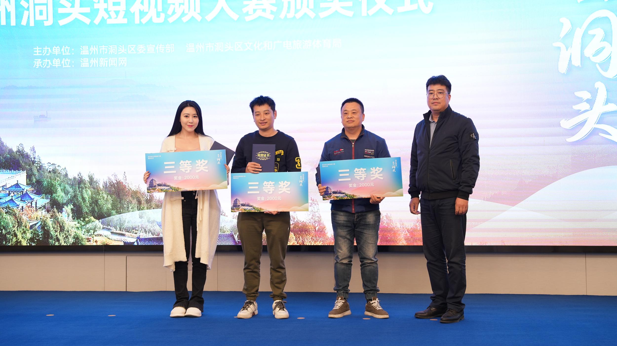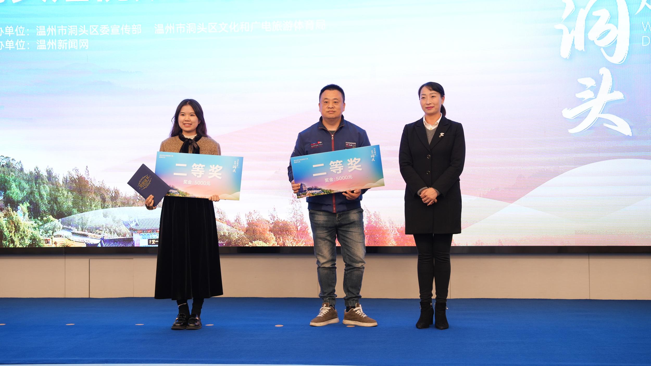 优秀作品获奖代表领奖现场,大赛组委会还对获得三等奖以上的5位作者颁发了“洞头文旅推荐官”荣誉称号。未来,他们将成为洞头旅游推广的重要使者,通过自己的作品和经验,向更多人传递洞头这个美丽海岛的独特魅力。