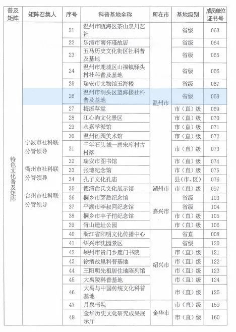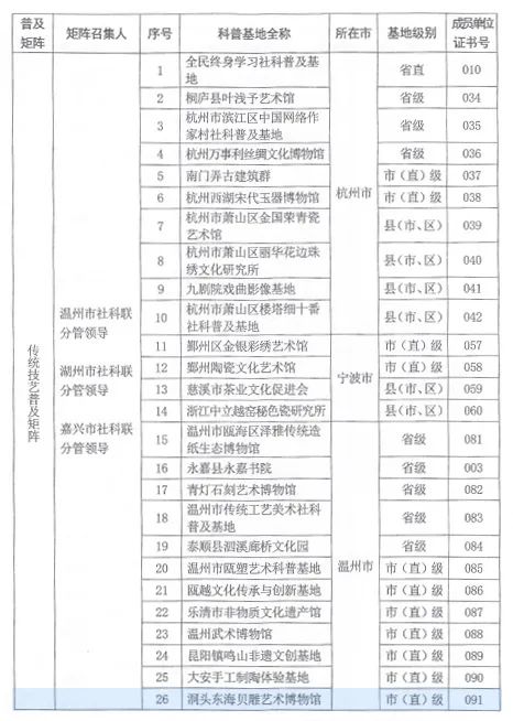 近日 省社科联公布了 浙江省优秀传统文化普及基地 联盟成员单位名单 温州市洞头区望海楼社科普及基地 洞头东海贝雕艺术博物馆 成功上榜 左右滑动查看 ⬆ 省社科联组建浙江省优秀传统文化普及基地联盟。联盟根据各成员单位工作内容和属性的不同,共设立“特色文化”“地域文化”“传统技艺”“民俗生活”四大普及矩阵。其中,温州市洞头区望海楼社科普及基地被列入“特色文化普及矩阵”,洞头东海贝雕艺术博物馆被列入“传统技艺普及矩阵”。 温州市洞头区望海楼社科普及基地 陈裕法 | 摄 望海楼于2018年获“浙江省社会科学普及示范基地”称号。该基地展示厅分五层,分别以耕海牧鱼、闽瓯风情、非遗奇葩等为主题,全面展示洞头海岛浓郁的海洋民俗特色文化,是洞头历史文化的窗口和百岛旅游第一景。望海楼对外开放至今,已接待国内外游客21万余人次,开展社科普及宣传活动达百余场。 洞头东海贝雕艺术博物馆 东海贝雕艺术博物馆于2015年获“温州市社会科学普及示范基地”称号,目前是国内首家以螺钿文化为主题的博物馆。该基地通过传承人培训、名师带徒等形式,活态保护老艺人绝技绝艺,培养省市区级“非遗”贝雕项目代表性传承人7名,市助理工艺师和技师10余名,优秀民间文艺家3人,中国文物学会会员2人。该基地还入选了2022年中国“非遗工坊典型案例”,获评“首批省级非物质文化遗产体验基地”等众多荣誉。 这次两家基地入选省优秀传统文化普及基地联盟成员单位,标志着洞头区社科文化普及步入了一个新阶段。 接下来,洞头区将以此为契机,深入挖掘传统文化,加强传统技艺保护与传承,全面提质升级各项社科工作,努力建成一批凸显洞头元素、海岛特色、海丝文化等主题鲜明、功能齐全的精品基地,更好地满足人民群众对社会科学的期盼和需求。 来源:区社科联 编辑:陈彩妮 审核:陈滨献 监制:郭建春 总监制:南建东 洞头区融媒体中心全媒体矩阵: 纸媒:洞头新闻(网址:jrdt.dtxw.cn点击查看) 电视:洞头电视台(新闻综合频道) 广播:洞头人民广播电台(FM100.9) 网络:洞头新闻网(网址:www.dtxw.cn点击查看 ) 微信公众号:洞头发布(DongTouFaBu)、洞头融媒(dtqcmzx) 新闻客户端:百岛洞头app(下载地址: http://h5.cztv.com/dongtou/h5/download/点击查看 ) 抖音号:邂逅洞头 视频号:洞头融媒 支付宝生活号:百岛洞头