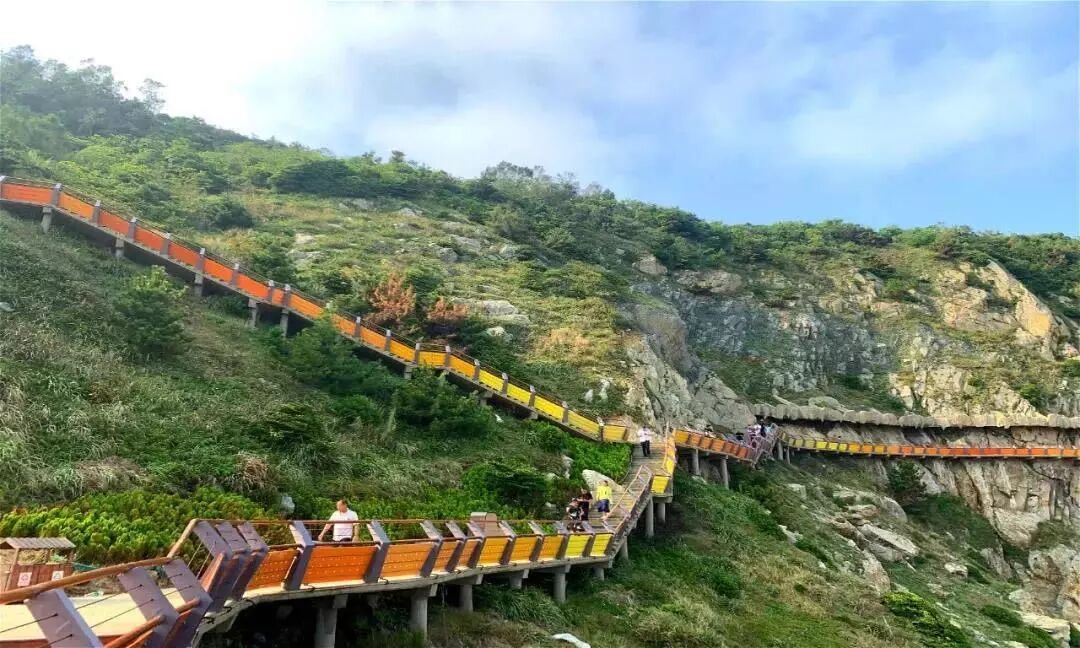 彩色的护栏如卧龙盘旋在南炮台山上,在此不仅能满足看海、听风、观景的需求,还能将沿途的礁石、悬崖、海景等尽收眼底。