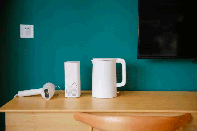 房间里不止有小爱同学,一系列小米产品——吹风机、热水壶……一应俱全。